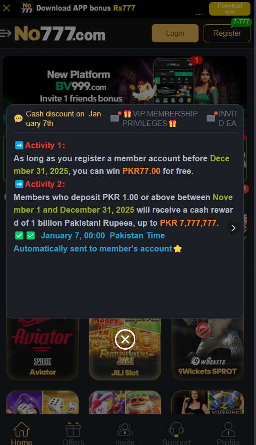 Register & Start Winning© 2026 NO777 Gaming Network Pakistan. Must be 18+ to play. Please play responsibly and manage your funds wisely.
